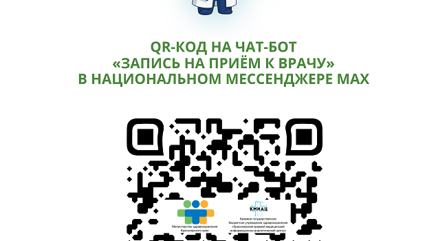У жителей Красноярского края появилась возможность записаться к врачу на прием через национальный мессенджер MAX. Найти чат-бот «Запись на прием к врачу» в MAX можно по QR-коду, указанному на картинке.