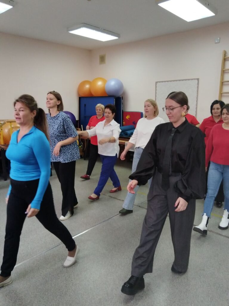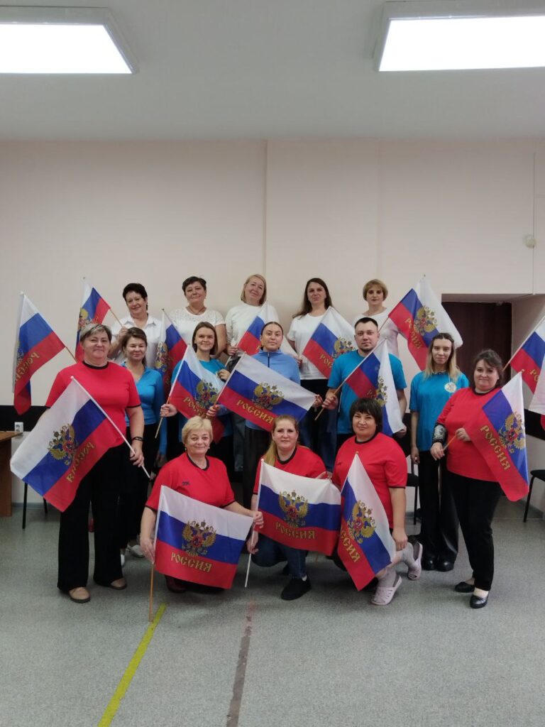 Ярким дополнением к завершению мероприятий стал спортивный танцевальный флешмоб, в котором участвовали сотрудники учреждения. Специалисты, одетые в футболки цветов российского триколора, под музыкальное сопровождение выполнили комплекс упражнений в спортивном зале учреждения. Коллективное фото с бело-сине-красными флажками завершило мероприятие, оставив приятные воспоминания о празднике.