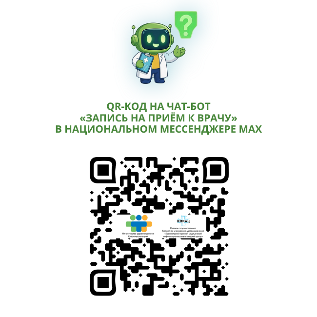 Найти чат-бот «Запись на прием к врачу» в MAX можно по QR-коду, указанному на картинке.
