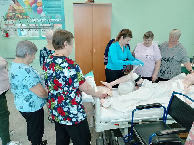 На занятии специалист социально-реабилитационного отделения рассказала о том, как защитить себя от тяжелых форм вирусных заболеваний и их осложнений, о необходимости вакцинации, соблюдении гигиены, дала некоторые рекомендации по укреплению иммунитета. Также подробно рассказала о видах кровотечений, как оказать первую помощь при кровотечении, показала на тренажере муляже как правильно наложить жгут, оказать первую помощь в критической ситуации, которая может возникнуть дома. В заключение слушатели смогли отработать навыки на практике, задать волнующие их вопросы и получить ответы.